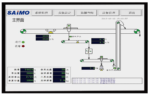 賽摩采樣設(shè)備運(yùn)行監(jiān)控管理系統(tǒng)軟件主界面菜單有系統(tǒng)監(jiān)控、參數(shù)設(shè)置、數(shù)據(jù)查詢(xún)、設(shè)備管理等,主界面可以實(shí)時(shí)顯示批量、采樣單元量、第幾個(gè)采樣單元、采樣單元累計(jì)量、初級(jí)采樣機(jī)采樣次數(shù)、初級(jí)采樣機(jī)一次采樣量、二次采樣機(jī)采樣次數(shù)、總樣質(zhì)量、故障報(bào)警等信息。其中數(shù)據(jù)查詢(xún)菜單可以輸出采樣比控制圖、抽取比控制圖、采樣記錄等,設(shè)備管理菜單有記錄采樣設(shè)備的維修,保養(yǎng),標(biāo)定記錄日志及相關(guān)的文件。